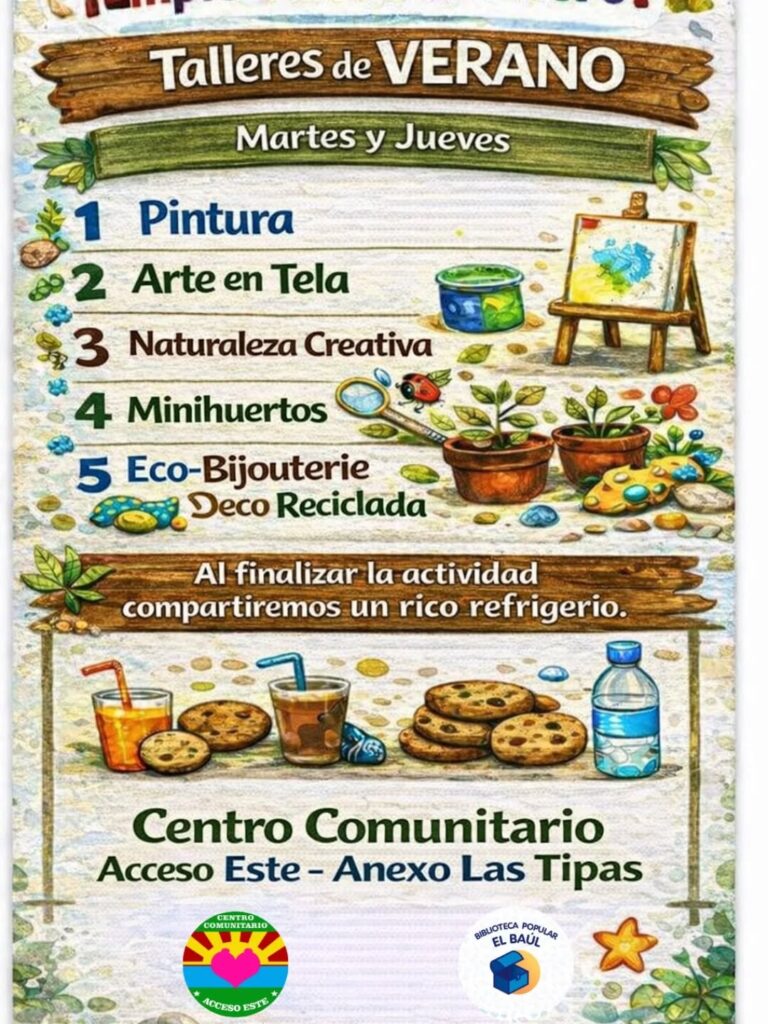 Invitamos a todos los chicos y chicas del barrio a sumarse a nuestros Talleres de Verano, un espacio para compartir, crear, aprender y pasarla lindo juntos